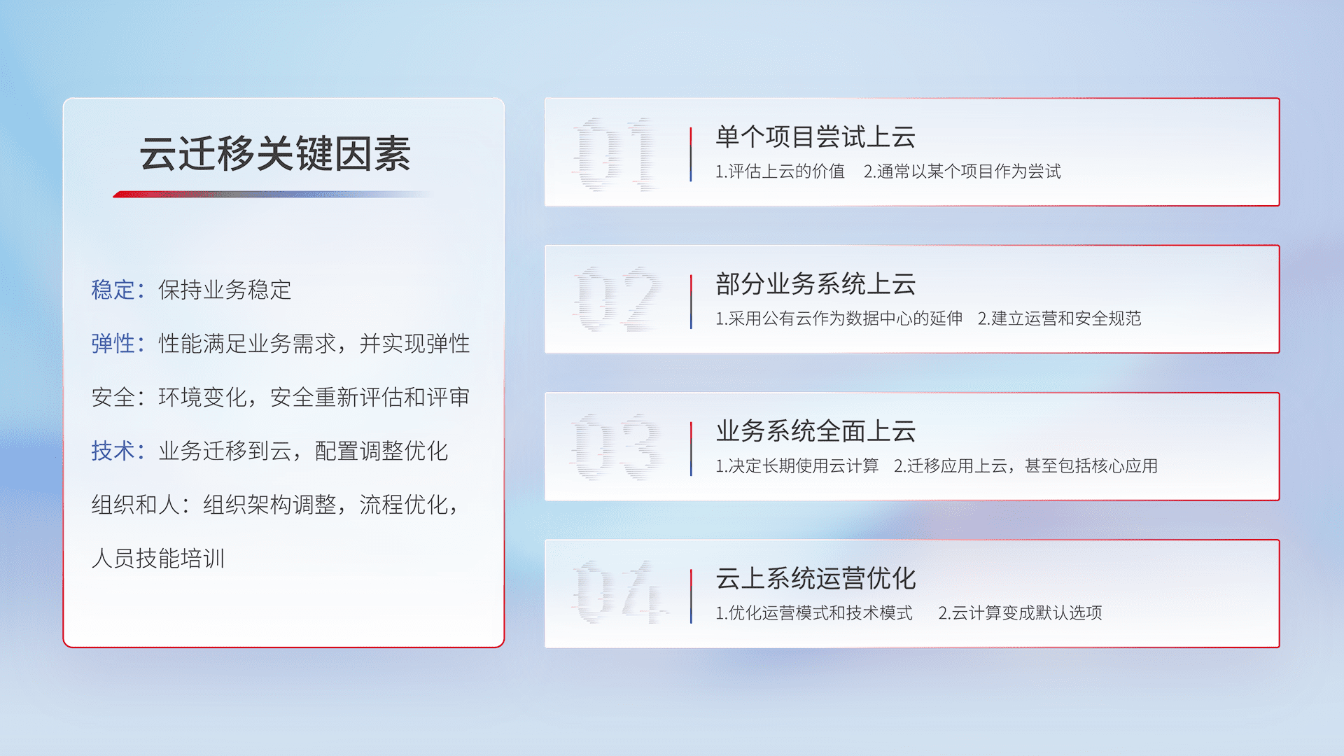 结合实际业务,,从规划设计、、、云平台选型、、、云原生改造、、数据迁移、、、、集成交付,,迁移全过程为客户识别最佳上云路径,,做好风险识别管理,,设计网络架构、、、身份权限、、、、安全审计合规、、操作审计、、、、日志审计、、、监控告警策略、、、多站点容灾设计等,,,对云上基础设施进行整体规划,,,提升IT治理水平,,,以满足弹性、、高可用、、、高性能的需求。。