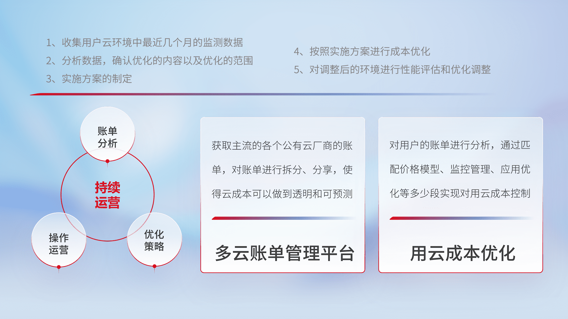 通过多云纳管,,,以统一的资源数据模型把客户的云资源进行抽象和封装,,进而实现对多云资源的统一操作,,,保障云资源管理的可靠性、、稳定性与可用性。。。。量身定制化运维内容,,,配置、、、、开发运维、、、、补丁管理、、、、备份、、、、监控、、、、认证和访问管理、、、审计和日常巡检等,,,,保障在用云过程中的可靠度,,稳定度以及高可用率。。。